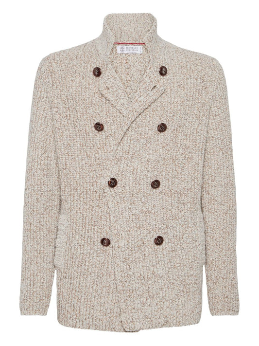Brunello Cucinelli Mouliné virgin wool, silk and cashmere half English rib one-and-a-half breasted cardigan with metal buttons