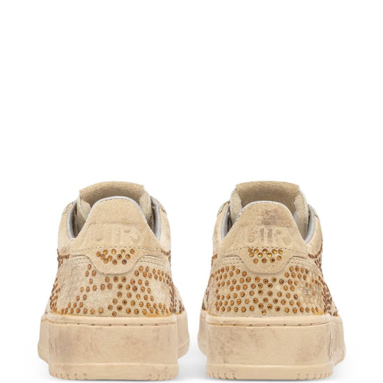 Sandy cream rhinestone embellishment suede accents flat laces rubber sole medialist low leather sneakers