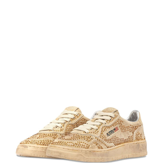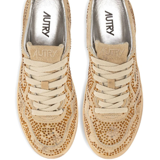 Sandy cream rhinestone embellishment suede accents flat laces rubber sole medialist low leather sneakers