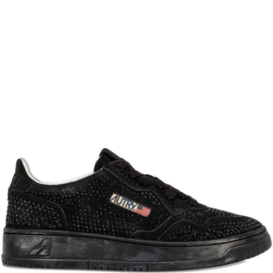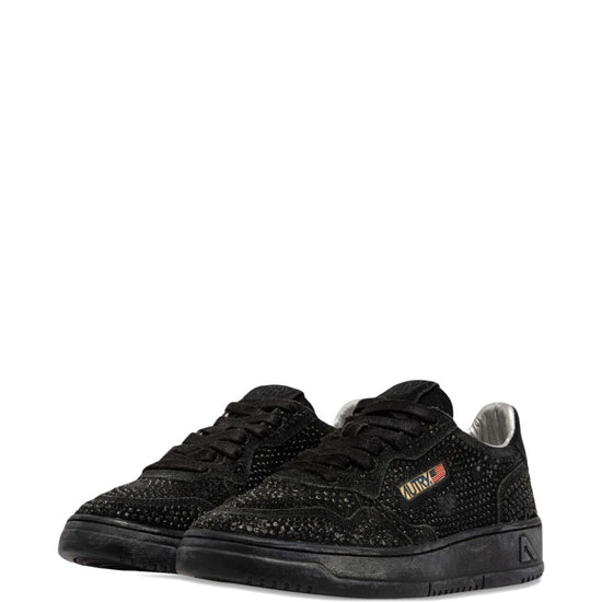 Black suede panels rhinestone embellishment low-top round toe rubber sole medialist low leather sneakers