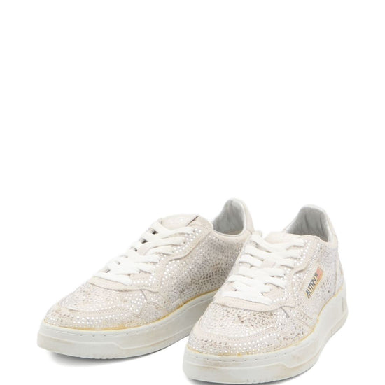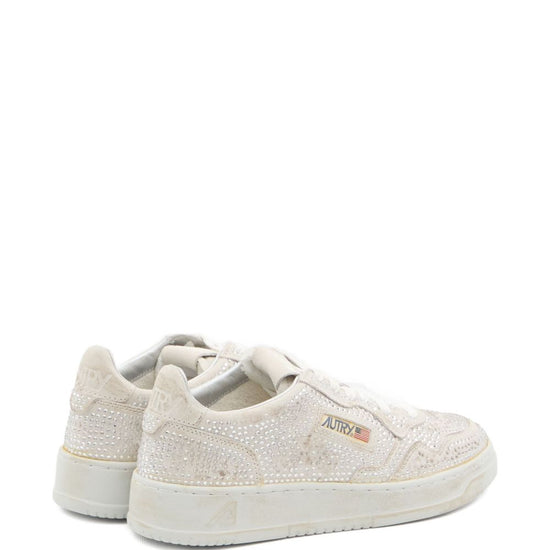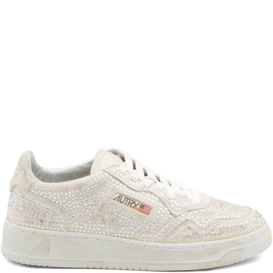 White rhinestone embellishment round toe lace-up closure side logo meadialist low leather sneakers