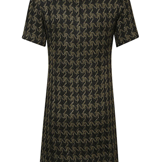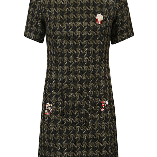 Short green dress, short sleeves, hidden zip closure, crewing, two in front pockets. houndstooth wool blend short dress size and fit - this piece fits true to size. we recommend you get your regular size. model is 1,75m / 5ft 8in wearing size s