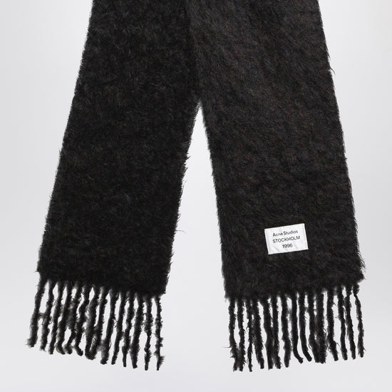 Acne studios black scarf crafted from a mohair blend with a fuzzy texture for a soft, warm feel. finished with fringed ends and an acne studios logo tab.