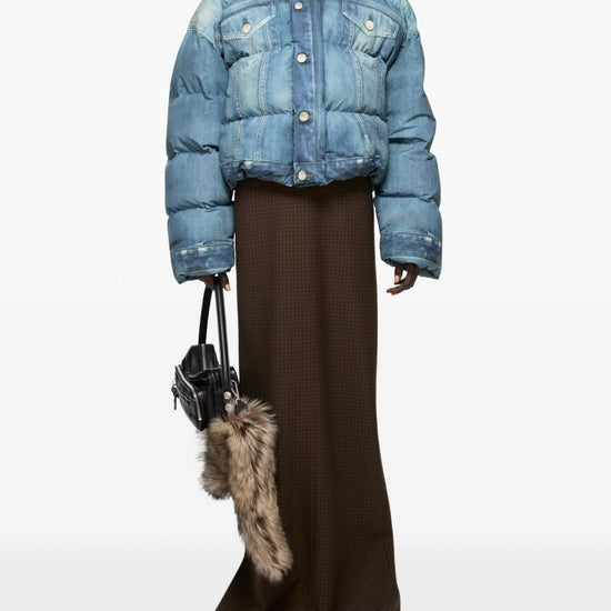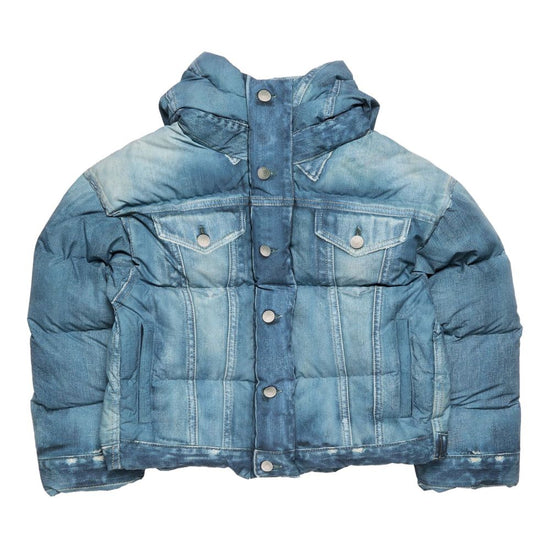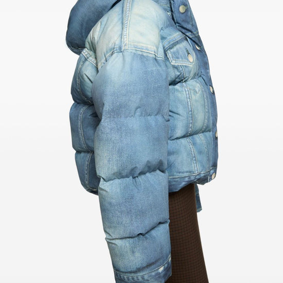Blue denim panels hooded neckline button fastening quilted design denim down jacket