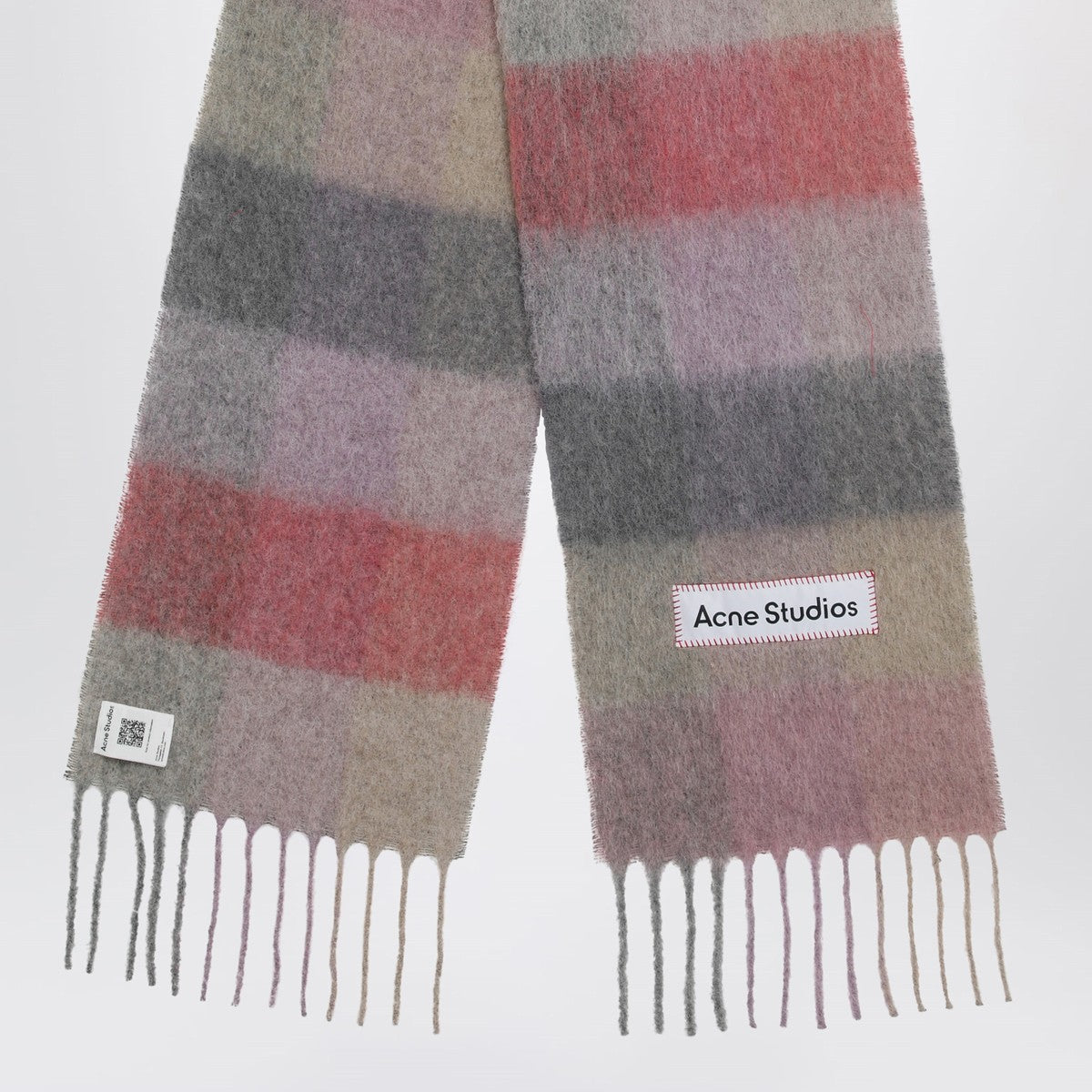 Acne studios fuchsia/lilac/pink checked scarf is made of a soft mohair blend with fringed ends. detailed with an embroidered logo.