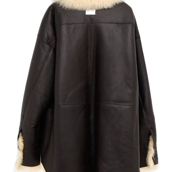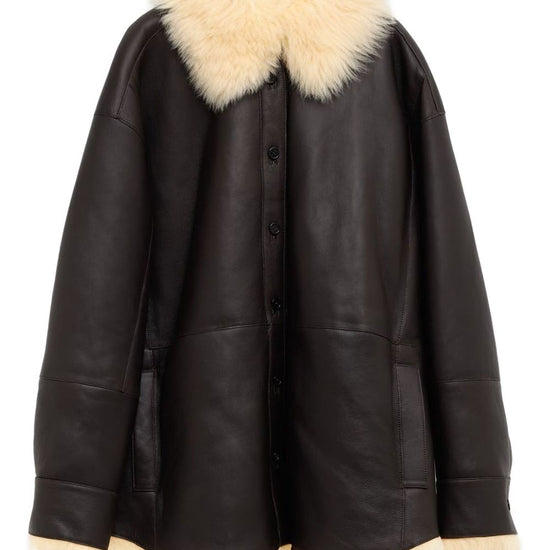 Coffee brown fur trim button fastening long sleeves leather shearling jacket