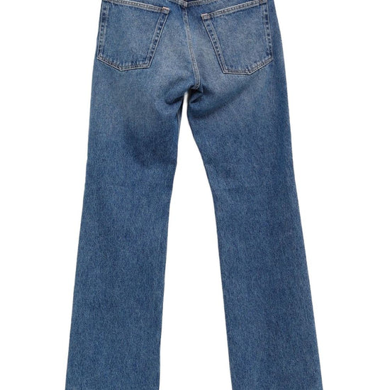 Blue organic cotton front button and zip fastening belt loops classic five pockets rear logo patch denim cotton jeans