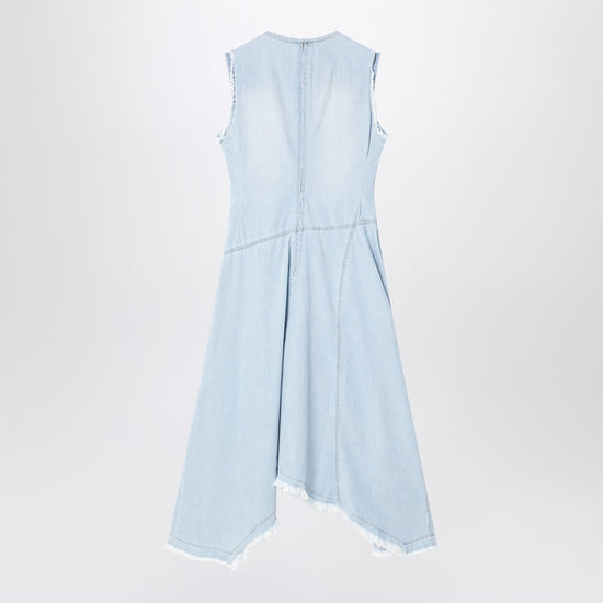 Acne studios light blue cotton denim sleeveless crew neck dress with asymmetric hemline.