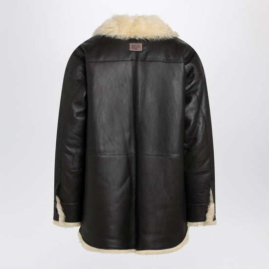 Shirt jacket by acne studios crafted from full-grain leather with soft shearling lining featuring, a center front button-up closure, side welt pockets, and an acne studios metal plaque at the back neckline, cut to a relaxed fit and below-hip length.