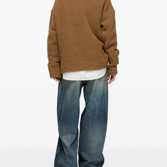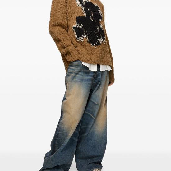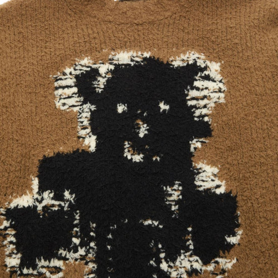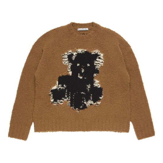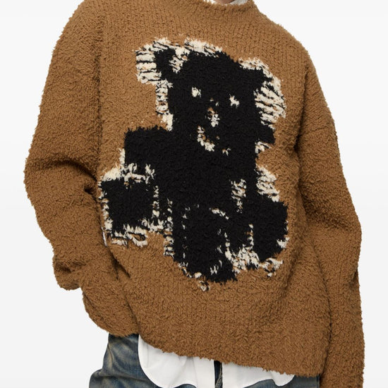Brown teddy-bear intarsia wool blend long sleeves crew neck wool crewneck sweater