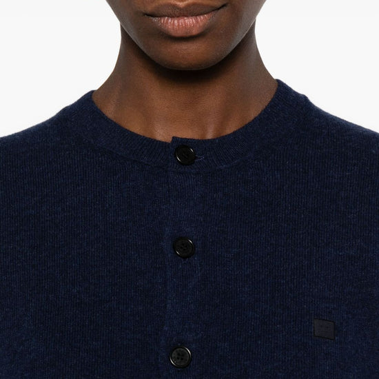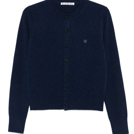 Navy blue button fastening round neck long sleeves logo patch wool cardigan