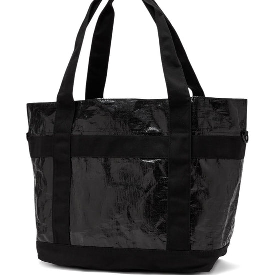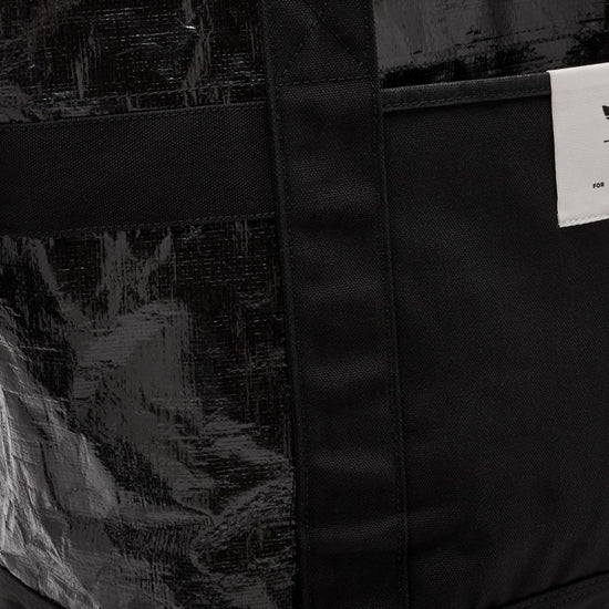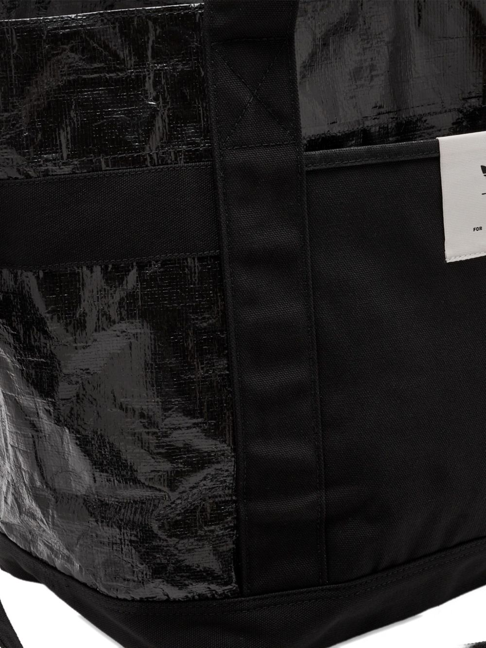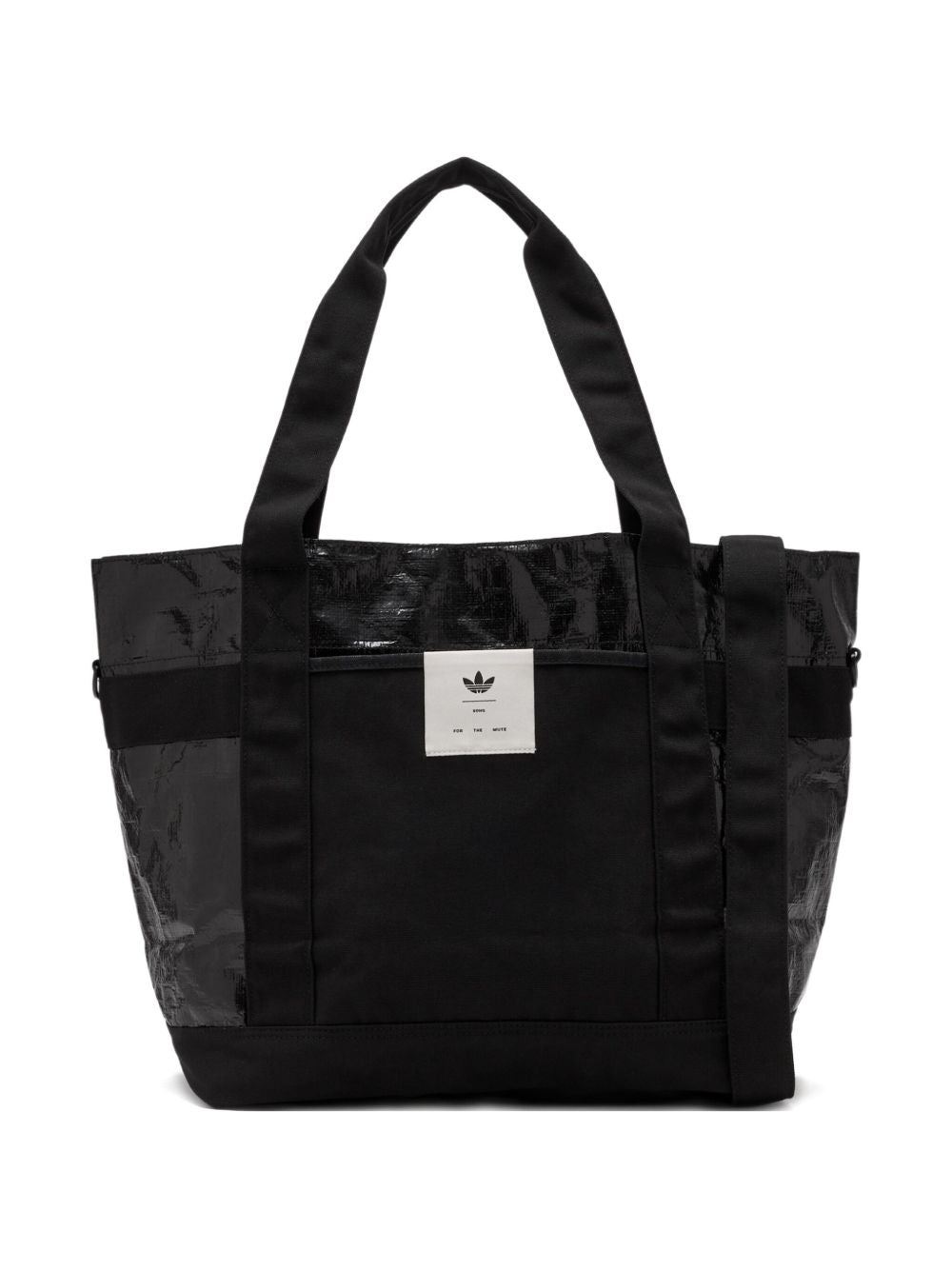 Black top handle shoulder strap panelled design internal zip-fastening pocket front logo patch tote bag