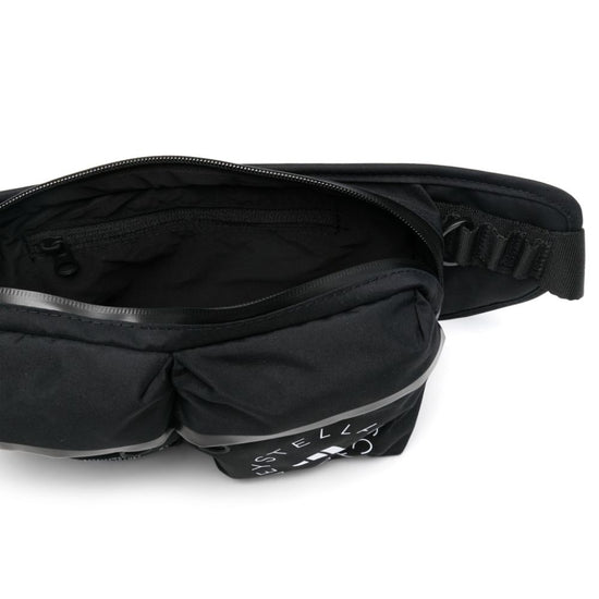 Black recycled polyester textured finish logo print to the front top zip fastening adjustable waist strap front zip fastening pockets main compartment logo bumbag