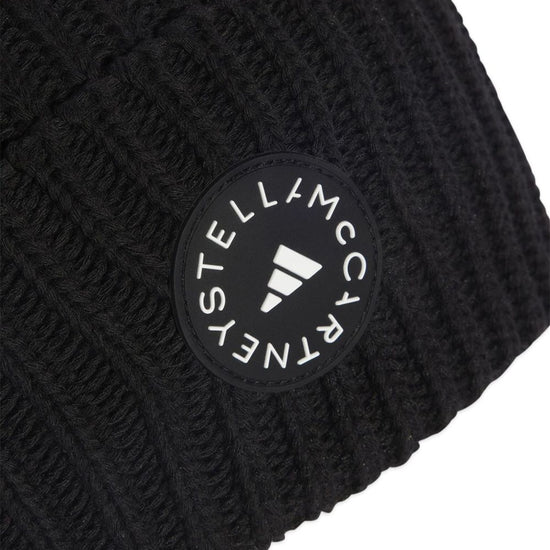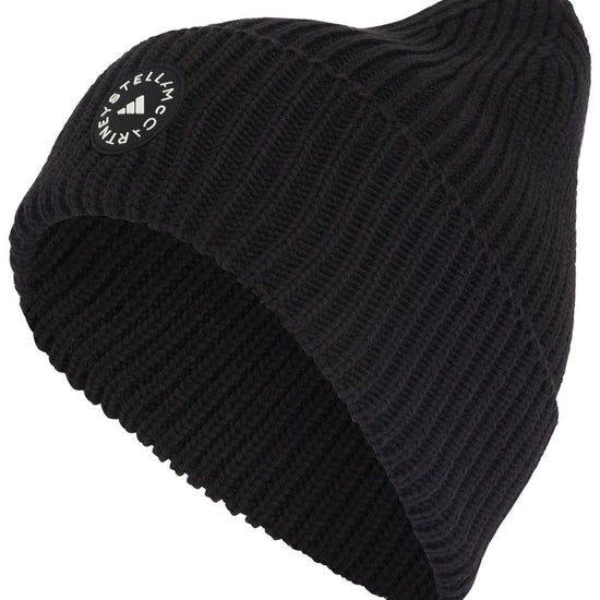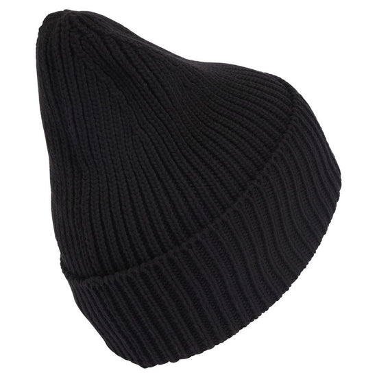 Black/white cotton ribbed knit logo patch to the front turn-up brim pull-on style cotton blend beanie