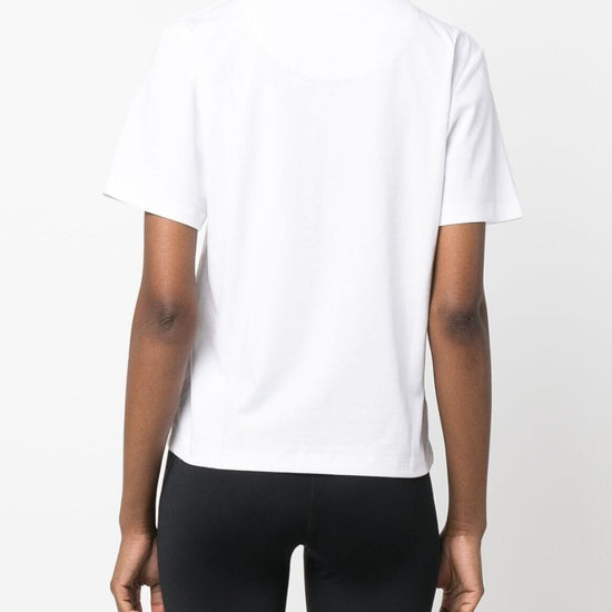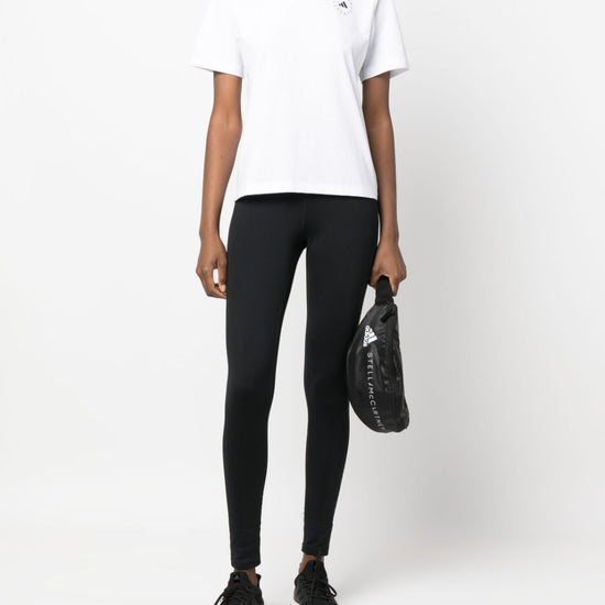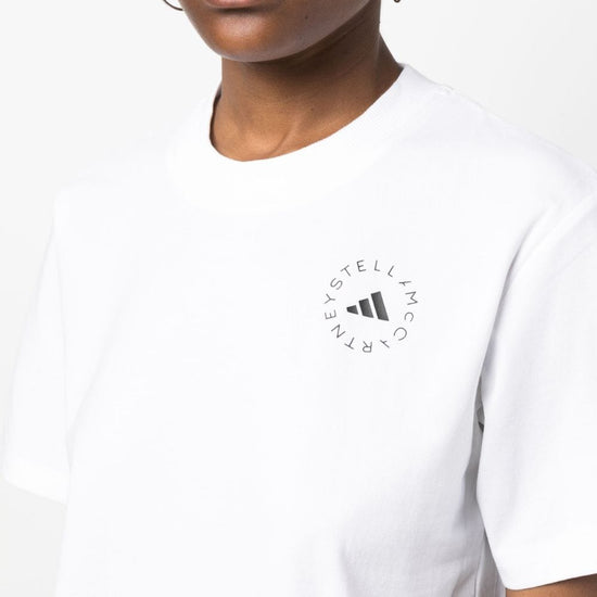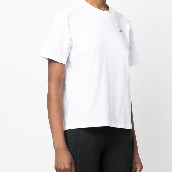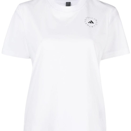 Logo-print short-sleeved t-shirt from adidas by stella mccartney featuring optical white, jersey knit, logo print at the chest, crew neck, short sleeves and straight hem. this item is made from at least 50% recycled or upcycled materials. for recycled synthetic clothing products, we highly recommend using a microfibre-catching washing bag to ensure that no microplastics that can pollute water are released in the process.. learn more about what makes a product conscious on our conscious criteria page. logo sporty t-shirt size and fit - this piece fits true to size. we recommend you get your regular size. model is 1,75m / 5ft 8in wearing size s