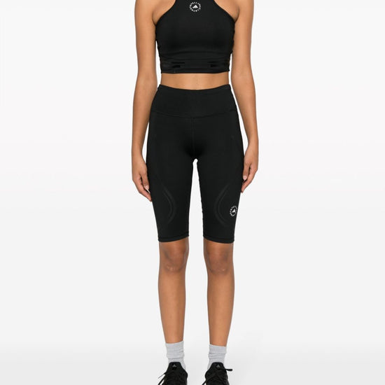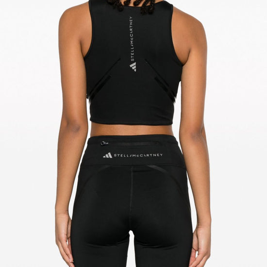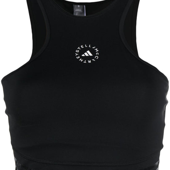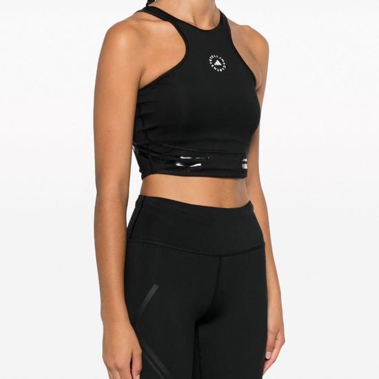Logo-print cropped top from adidas by stella mccartney featuring black, recycled polyester, logo print to the front, crew neck, sleeveless, racerback and cropped. this item is made from at least 50% recycled or upcycled materials. for recycled synthetic clothing products, we highly recommend using a microfibre-catching washing bag to ensure that no microplastics that can pollute water are released in the process.. learn more about what makes a product conscious on our conscious criteria page. crop, sportivo, logo, s/m logo sports cropped top size and fit - this piece fits true to size. we recommend you get your regular size. model is 1,75m / 5ft 8in wearing size s