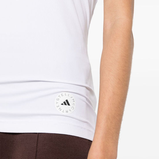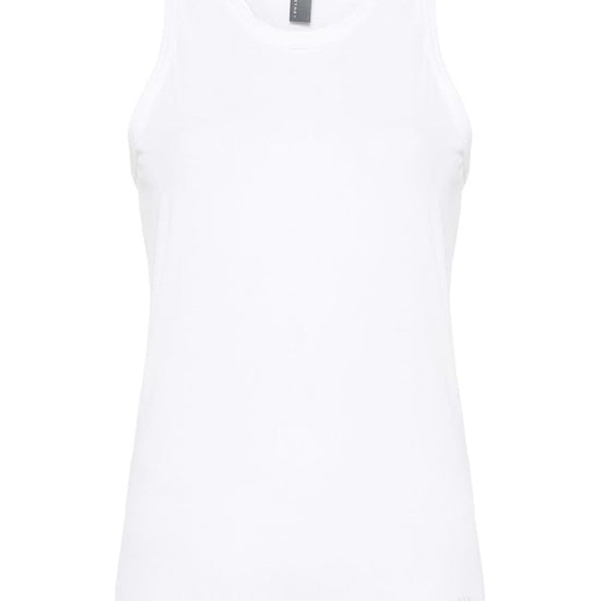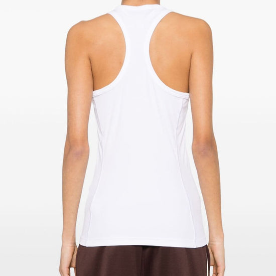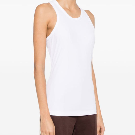White recycled polyamide blend fine ribbed crew neck sleeveless logo print to the side racerback internal logo tag straight hem this item is made from at least 50% recycled or upcycled materials. for recycled synthetic clothing products, we highly recommend using a microfibre-catching washing bag to ensure that no microplastics that can pollute water are released in the process. we've partnered with good on you — an independent agency that rates how brands perform in relation to their impact on the planet, people and animals, with a multi-criteria rating simplified to a five points scale. in order to be awarded our conscious label, larger brands need to score a minimum of four out of five ('good'), while smaller brands must score at least three out of five ('it's a start'). this item comes from a brand rated four out of five ('good') by good on you at the time it was added on farfetch. please note, this is a brand-level rating and does not guarantee that this product is made with cons logo ribbed tank top size and fit - this piece fits true to size. we recommend you get your regular size. model is 1,75m / 5ft 8in wearing size s