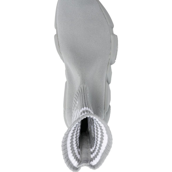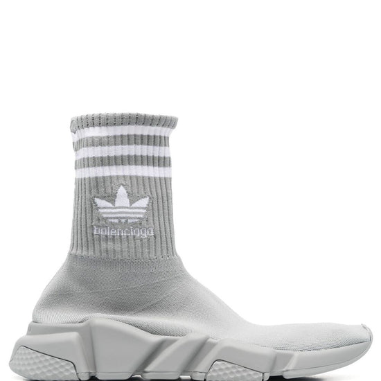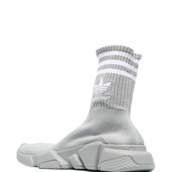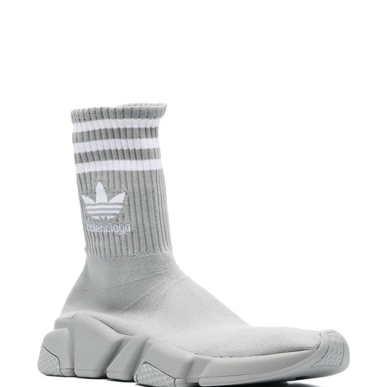 X adidas speed sock-style sneakers from balenciaga featuring grey, white, knitted construction, ribbed knit, embroidered logo to the side, stripe detailing, sock-style ankle, almond toe and chunky rubber sole. conscious: we've partnered with good on you – an ethical agency that rates how sustainably brands perform. this item comes from a brand that performs well in relation to their impact on the planet.. speed lt sneakers size and fit - heel 1,6 in / 4 cm; platform 0,8 in / 2 cm