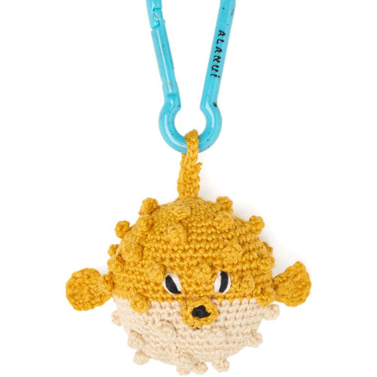 Sunlight yellow and sand beige crochet fish design blue carabiner clip all products are handcrafted. puffer fish crochet keyring
