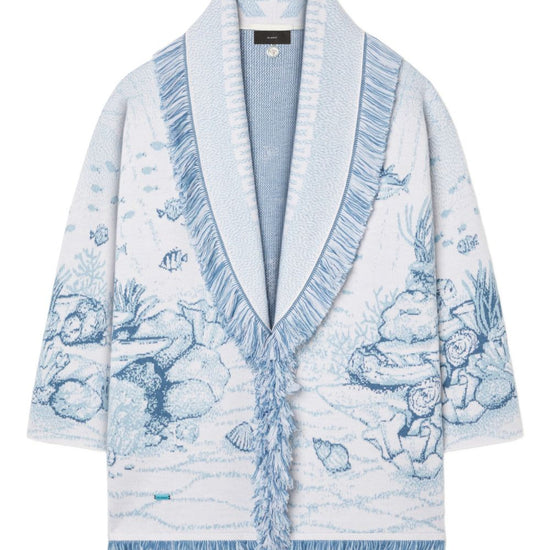 White and blue adjustable detachable waist belt fringe detailing deep in the ocean wool cardigan