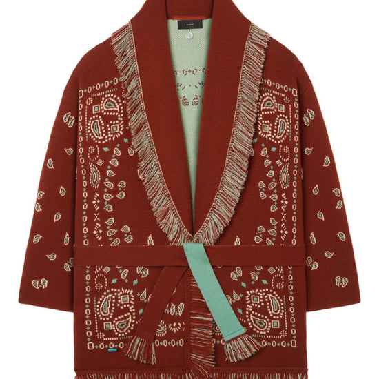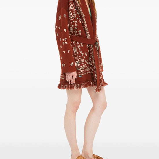 Brown jacquard design fringed trim shawl lapels belt bandana jacquard cashmere cardigan