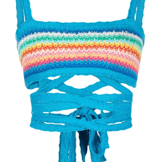 Over the rainbow knitted bra from alanui featuring knitted construction, sleeveless, square neck, crossover strap detail, rear tie fastening, blue/multicolour and crochet design. c/spalline, con lacci over the rainbow top size and fit - this piece fits true to size. we recommend you get your regular size. model is 1,75m / 5ft 8in wearing size s