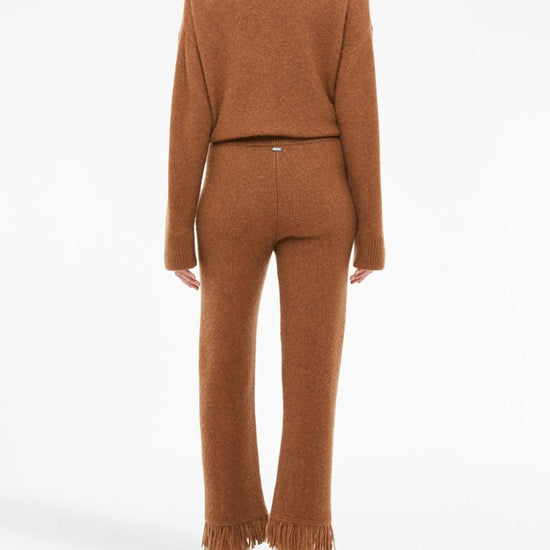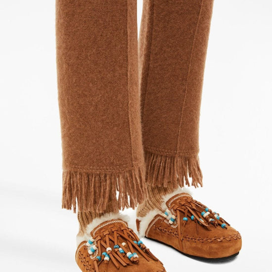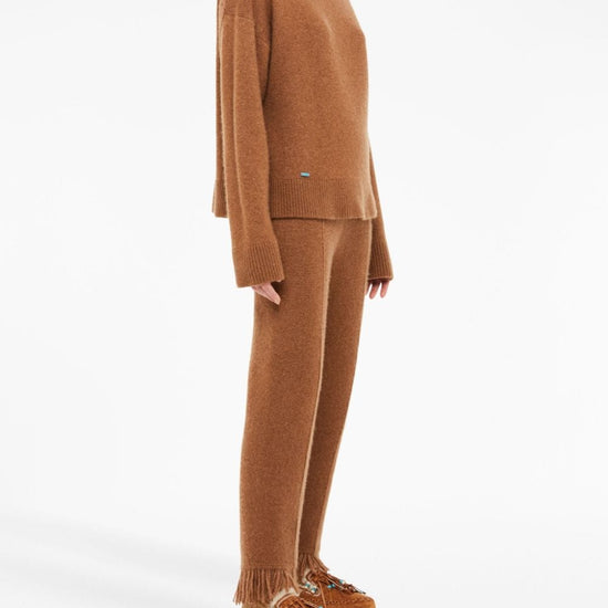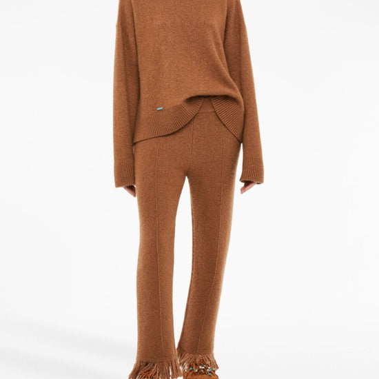 Fringe-detail knit trousers from alanui featuring camel brown, cashmere, silk, fine knit, fringe detailing and elasticated waistband. icon jacquard cardi-bomber cashmere and silk blend trousers size and fit - this piece fits true to size. we recommend you get your regular size. model is 1,75m / 5ft 8in wearing size s