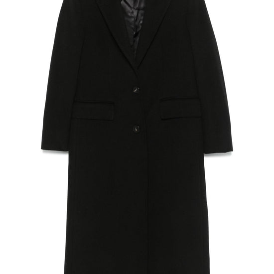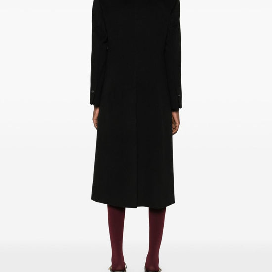 Black virgin wool front button fastening peak lapels shoulder pads long sleeves buttoned cuffs chest welt pocket two side flap pockets central rear vent logo-jacquard lining straight hem mid-length wool single-breasted coat size and fit - this piece fits true to size. we recommend you get your regular size. model is 1,75m / 5ft 8in wearing size 40 (it)