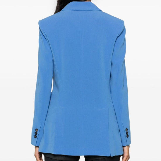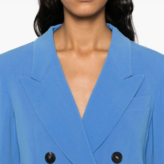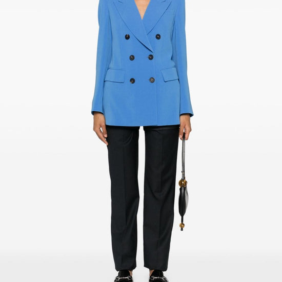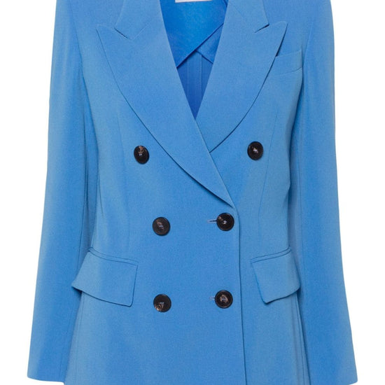 Cerulean blue crepe texture peak lapels shoulder pads long sleeves with buttoned cuffs chest welt pocket two front flap pockets english rear vents partial lining double-breasted button fastening double-breasted cady jacket size and fit - this piece fits true to size. we recommend you get your regular size. model is 1,75m / 5ft 8in wearing size 40 (it)