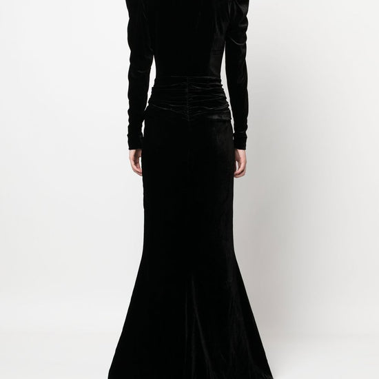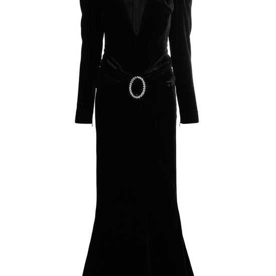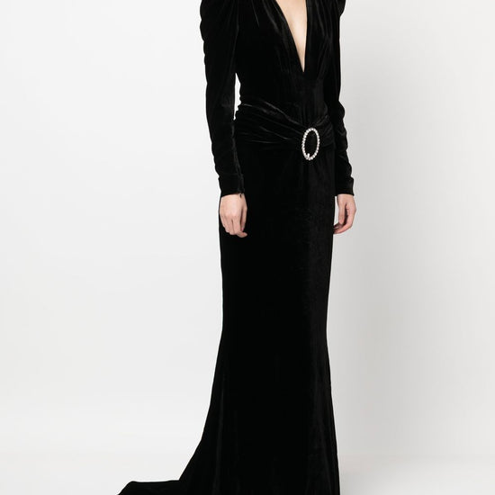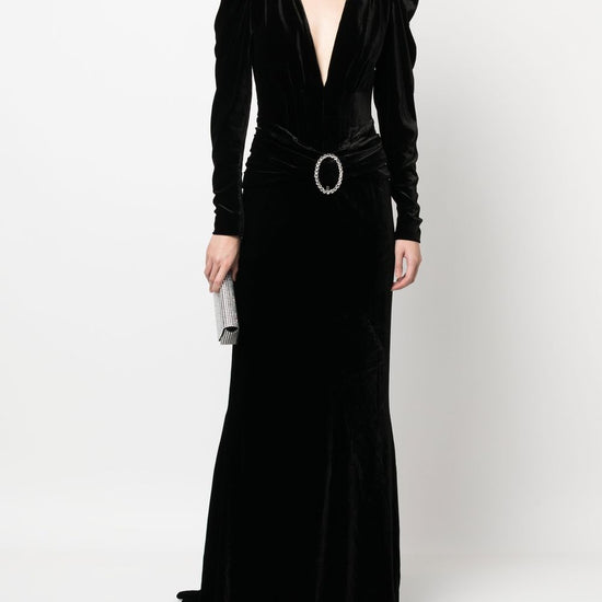 Belted velvet v-neck gown from alessandra rich featuring black, velvet, plunging v-neck, drop waist, belted waist, long sleeves, crystal embellishment, floor-length and ruched detailing. velluto, scollo profondo, fibbia in cristallo deep neckline velvet long dress size and fit - this piece fits true to size. we recommend you get your regular size. model is 1,75m / 5ft 8in wearing size 40 (it)