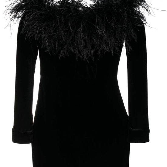 Feather-trim velvet minidress from alessandra rich featuring black, velvet, feather-trim detailing, strapless, long sleeves, fitted waistline and above-knee length. velluto, scollo profondo, fibbia in cristallo feather detail velvet short dress size and fit - this piece fits true to size. we recommend you get your regular size. model is 1,75m / 5ft 8in wearing size 40 (it)