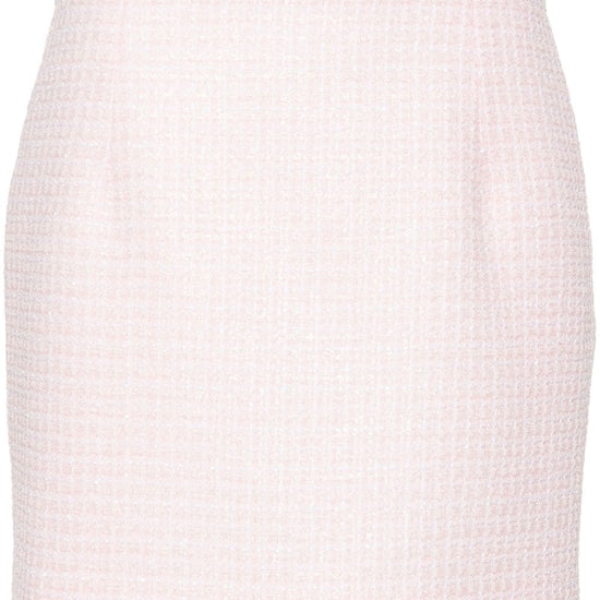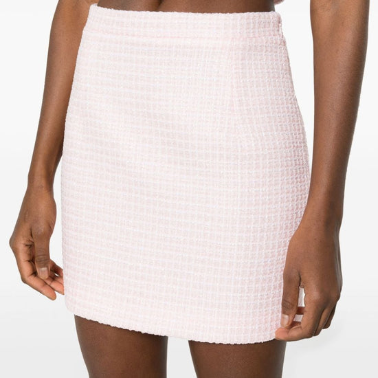 Light pink tweed sequin embellishment check pattern high waist dart detailing full lining thigh-length concealed side hook and zip fastening  sequin checked tweed mini skirt size and fit - this piece fits true to size. we recommend you get your regular size. model is 1,75m / 5ft 8in wearing size 40 (it)