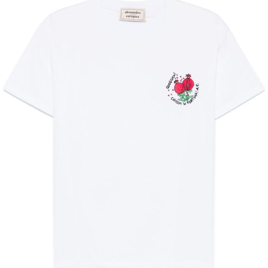 White cotton lightweight jersey embroidered slogan crew neck short sleeves straight hem embroidered cotton t-shirt size and fit - this piece fits true to size. we recommend you get your regular size. model is 1,75m / 5ft 8in wearing size s