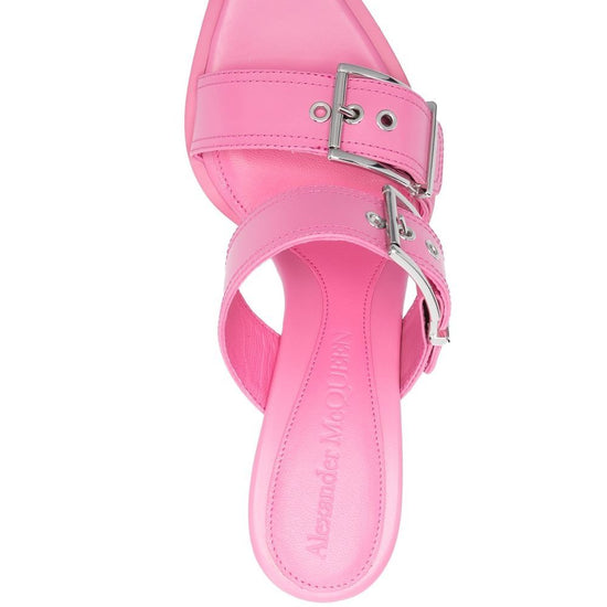 105mm buckle-detail sandals from alexander mcqueen featuring rose pink, calf leather, silver-tone buckle fastening, branded leather insole, open toe, high heel and slip-on style. punk double buckle leather sandals size and fit - heel 4,1 in / 10,5 cm; platform 0,4 in / 1 cm