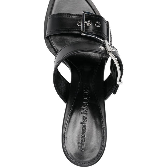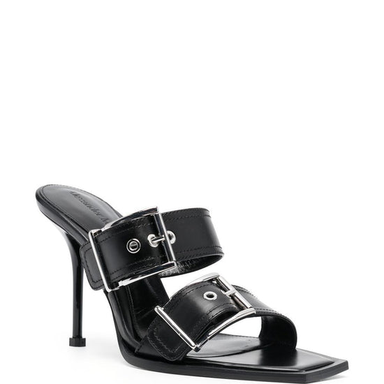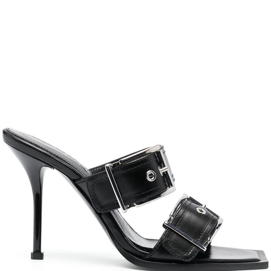 Buckle-detail sandals from alexander mcqueen featuring black, calf leather, buckle detail at the toe, branded insole, high stiletto heel and square toe. punk double buckle leather sandals size and fit - heel 4,1 in / 10,5 cm; platform 0,4 in / 1 cm