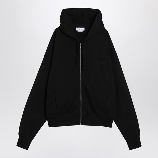 Black cotton balenciaga sweatshirt, characterized by a visible zip front closure, hood with drawstring, two front pockets, wide long sleeves, tone-on-tone logo lettering on the chest, ribbed edges, and a loose fit. size and fit - model wears size l model measurements: height: 187 cm chest: 102 cm waist: 76 cm hips: 92 cm