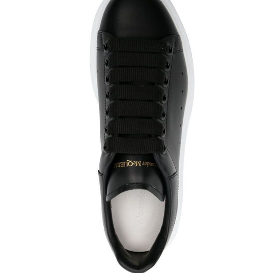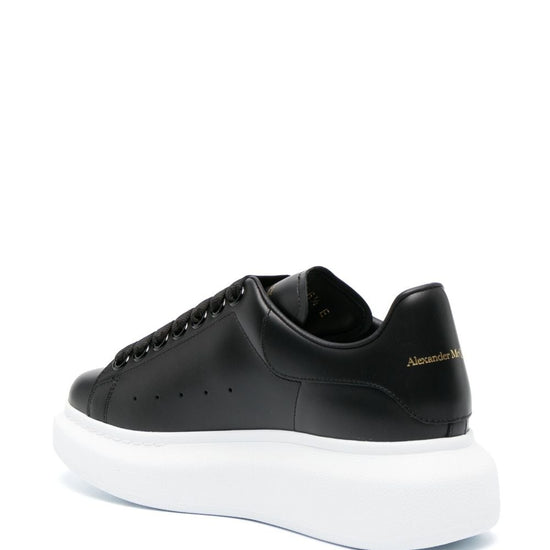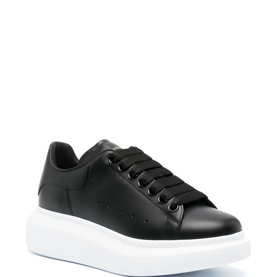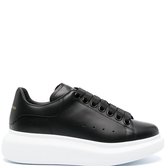 Black leather oversized low-top sneakers from alexander mcqueen featuring branded heel counter, logo-print tongue, round toe, front lace-up fastening and flat rubber sole. to lessen the environmental impact and to reduce cotton consumption, alexander mcqueen will no longer be providing a dust bag with its sneakers.. oversize sneakers size and fit - heel 1,8 in / 4,5 cm; platform 1,3 in / 3,2 cm