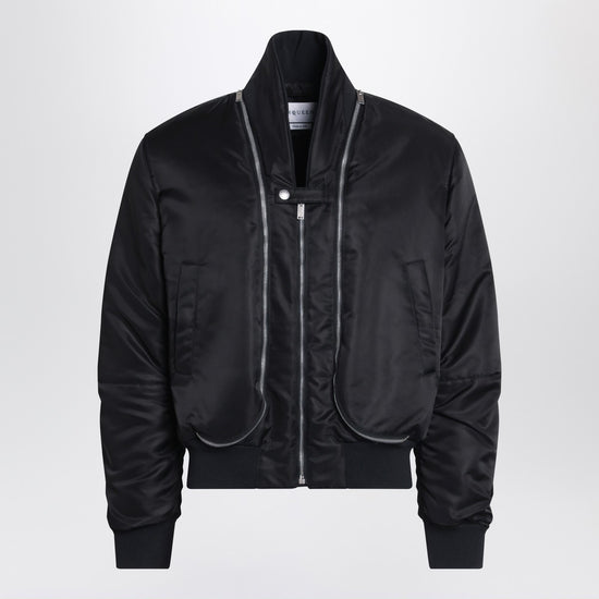 Bomber by alexander mcqueen in black nylon, featuring a front zip closure with a snap button tab, long sleeves, two side welt pockets, ribbed edges, front details with visible metal zip, and checkered lining. size and fit - model wears size 50 it model measurements: height: 187 cm chest: 102 cm waist: 76 cm hips: 92 cm