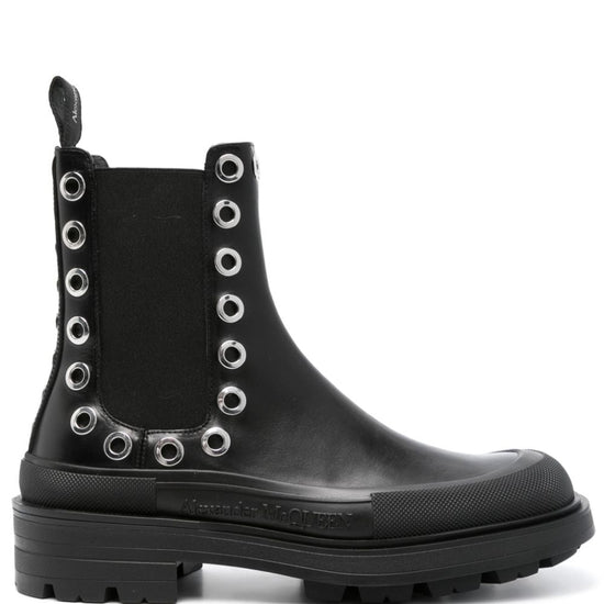 Eyelet-detail chelsea boots from alexander mcqueen featuring jet black, silver-tone hardware, metal eyelet detailing, logo pull-tab at the heel, elasticated side panels, round toe, chunky rubber sole and pull-on style. tread slick leather chelsea boots size and fit - heel 2 in / 5 cm
