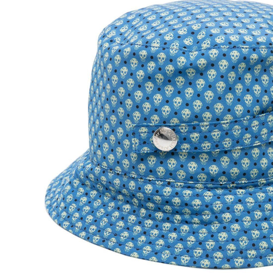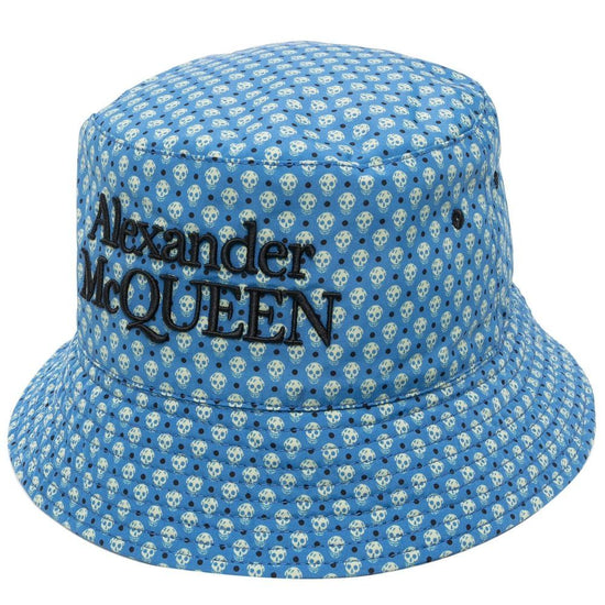 Skull-print bucket hat from alexander mcqueen featuring blue, cotton, dropped wide brim, skull print, embroidered logo to the front, eyelet detailing and strap and press-stud fastening. logo bucket hat size and fit - brim: 6.0 centimetres. circumference: 56.0 centimetres.
