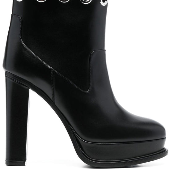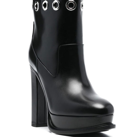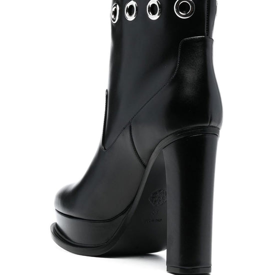 130mm platform-sole eyelet boots from alexander mcqueen featuring black, calf leather, almond toe, eyelet detailing, ankle-length, platform sole and high block heel. leather heel ankle boots size and fit - heel 5,1 in / 13 cm; platform 1 in / 2,5 cm