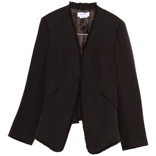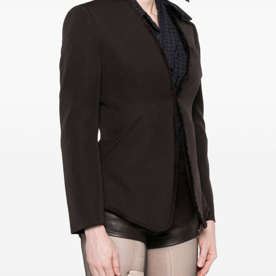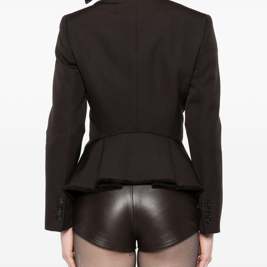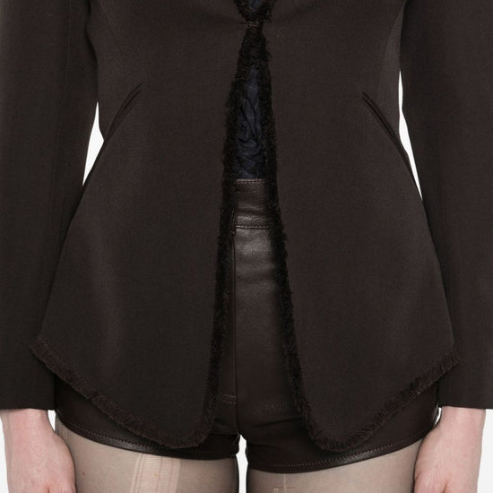 Brown wool v-neck fringed hem long sleeves welt pockets concealed front fastening wool single-breastded jacket