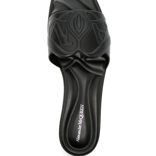 Black calf leather smooth grain logo-embossed strap logo at the sole square open toe branded leather cushioned insole leather outsole slip-on style this piece comes complete with a protective dust bag. seal leather flat sandals size and fit - heel 0,6 in / 1,5 cm