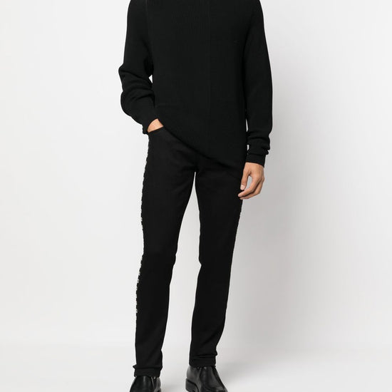 Mid-rise skinny jeans from alexander mcqueen featuring black, stretch-cotton, logo patch to the rear, belt loops, front button and zip fastening and classic five pockets. skinny fit denim jeans size and fit - this piece fits true to size. we recommend you get your regular size. model is 1,84m / 6ft 1in wearing size 48 (it)