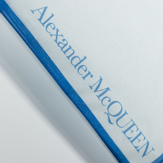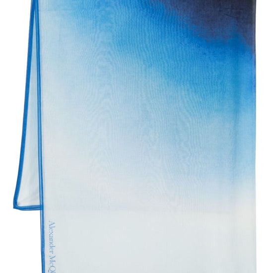 Gradient-effect logo scarf from alexander mcqueen featuring blue, cotton-silk blend, gradient effect, logo print to the side, rectangle shape and contrasting trim. printed silk blend cotton scarf