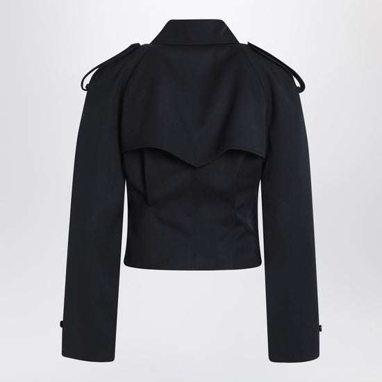 Short double-breasted jacket by alexander mcqueen in navy blue wool, characterized by front buttoning, two side welt pockets, wide long sleeves with ribbon at the cuffs, epaulettes on the shoulders, and a classic collar. size and fit - model wears size 42 it model measurements: height: 178 cm chest: 89 cm waist: 62 cm hips: 88 cm