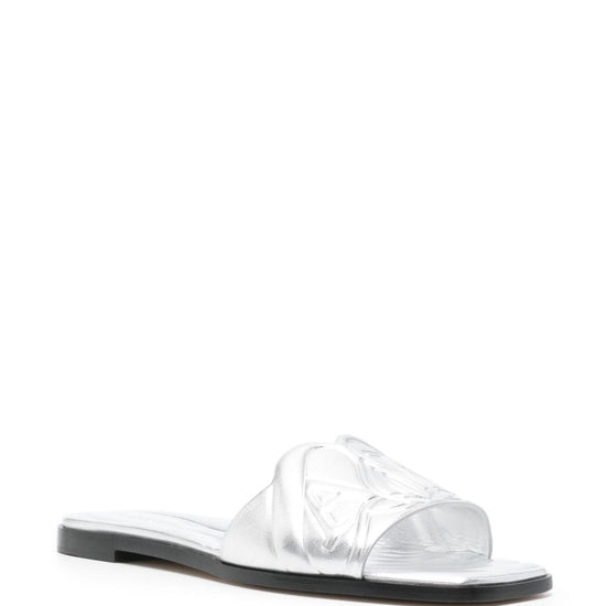 Silver-tone calf leather smooth grain metallic finish square open toe logo-embossed strap branded leather insole flat leather sole slip-on style seal leather sandals size and fit - heel 0,6 in / 1,5 cm