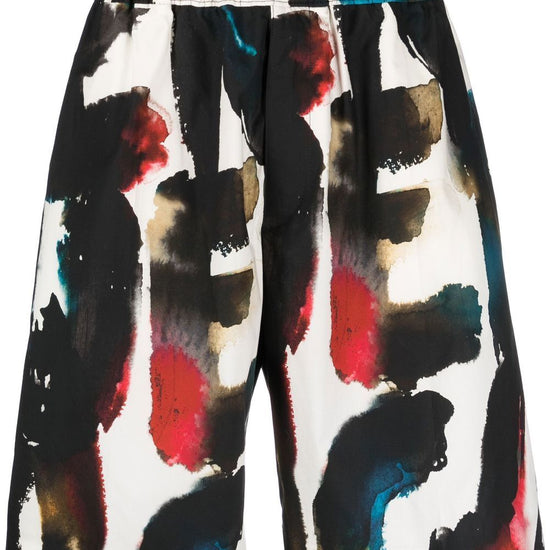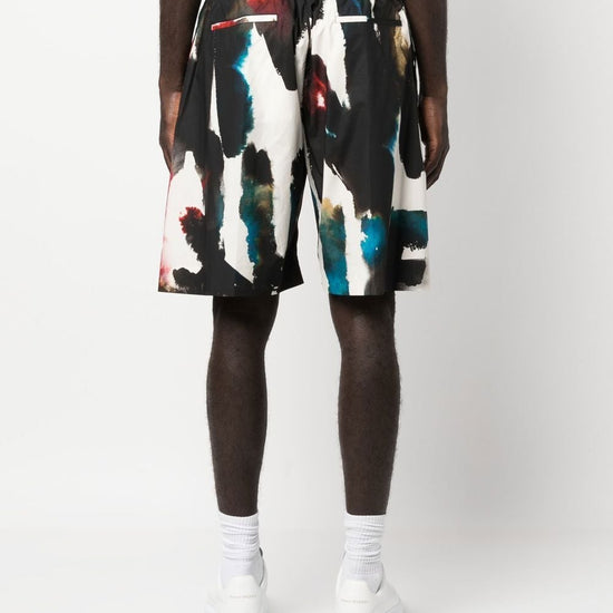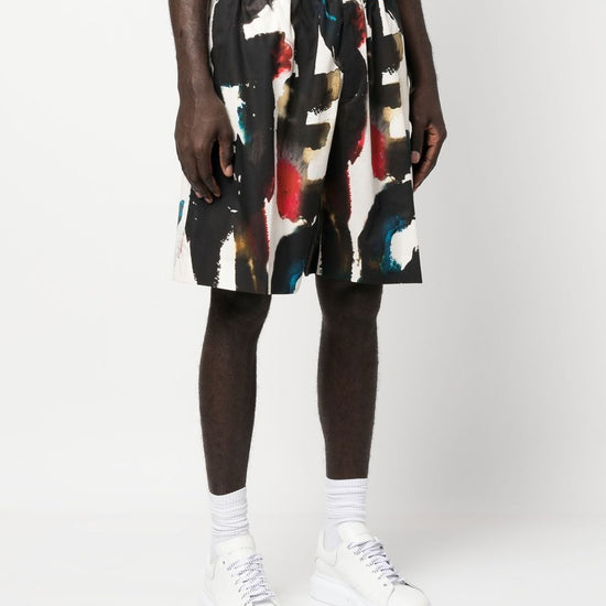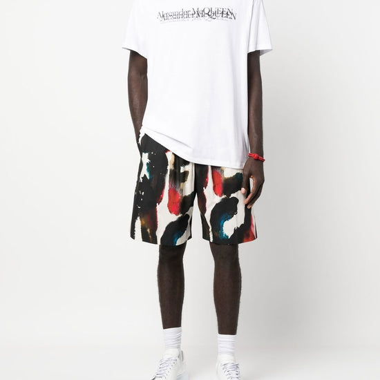 Logo-print straight-leg shorts from alexander mcqueen featuring two side inset pockets, two rear welt pockets, black/multicolour, cotton, all-over logo print and elasticated waist. printed shorts size and fit - this piece fits true to size. we recommend you get your regular size. model is 1,84m / 6ft 1in wearing size 48 (it)