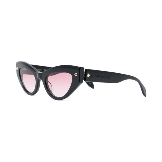 Cat-eye frame sunglasses from alexander mcqueen eyewear featuring logo-engraved arm, black/pink, cat eye frame, pink tinted lenses, straight arms and curved tips. these glasses come with a protective case.. cat eye sunglasses