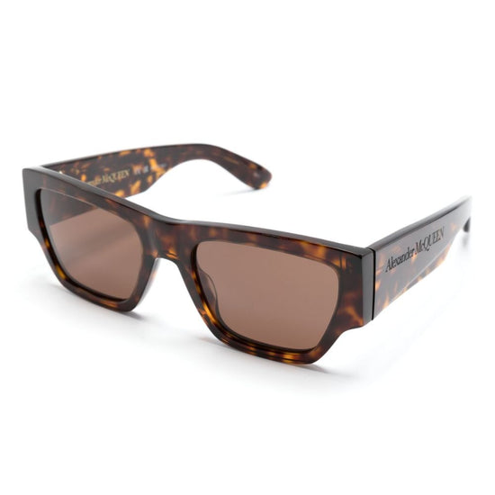 Square-frame sunglasses from alexander mcqueen eyewear featuring brown, acetate, tortoiseshell effect, brown tinted lenses, square shape, straight arms and curved tips. these glasses come with a protective case.. sunglasses